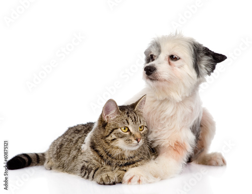 Obraz premium dog hugging cat. isolated on white background