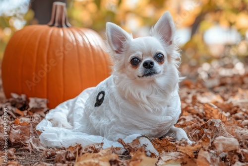 © Mykola, Fototapeta premium Dog in Ghost Costume: Funny Halloween Pose with Pumpkin and Autumn Vibes