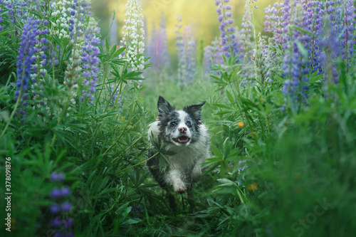 © Anna Averianova, Fototapeta premium dog in lupine flowers. Marble border collie in nature. Lovely pet
