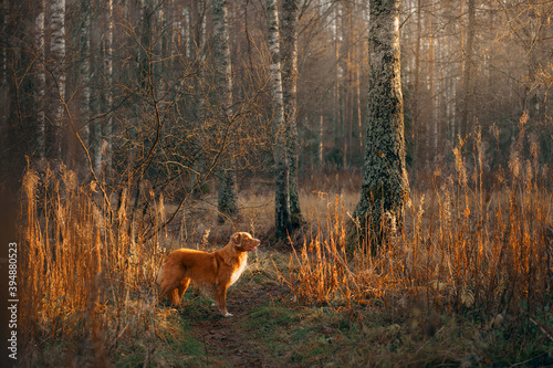 Naklejka premium dog in the autumn forest. Nova Scotia Duck Tolling Retriever for a walk on...