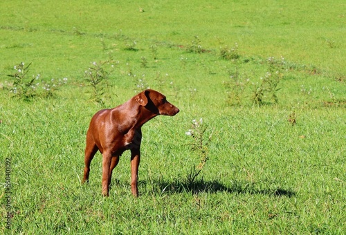 © Leonardo, Fototapeta premium dog in the green field smelling flowers