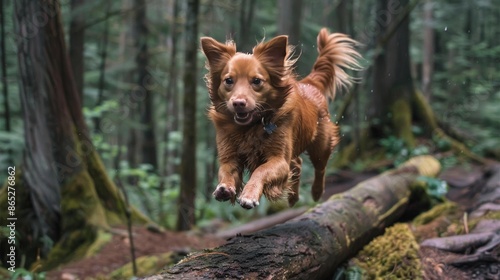 © PalaG, Naklejka premium Dog jumping over a log on a forest trail
