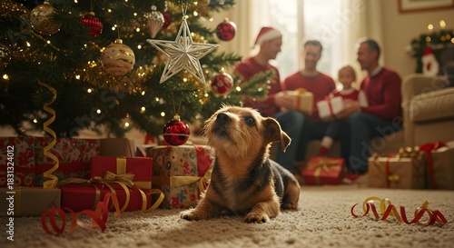 Obraz premium Dog looking up at christmas tree with family in background celebrating the...