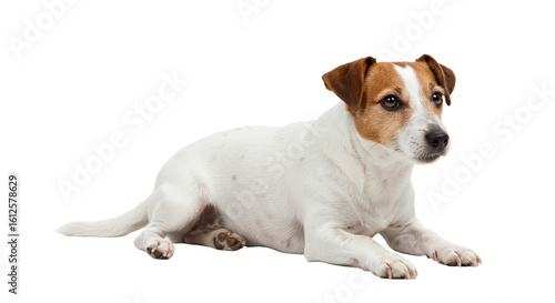 Obraz premium Dog Lying Down Looking Alert on White Background