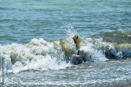 © PhotoBetulo, Obraz premium Dog playing with a stick by the sea. A dog brings a stick thrown into the sea.