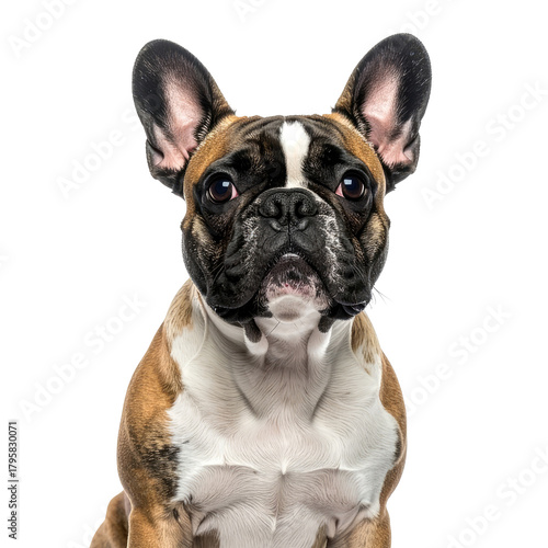 © Daru, Fototapeta premium Dog portrait Brindle and white puppy stares on a black background