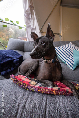 Fototapeta premium Dog relaxing on a cozy sofa with colorful pillows in a glamping