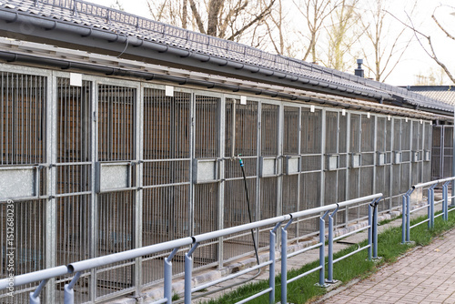 © Rabizo Anatolii, Obraz premium Dog rescue facility with numbered outdoor kennels and fencing. Animal shelter with caged kennels for stray and rescue dogs. Exterior view of animal shelter kennels showing multiple metal cages.