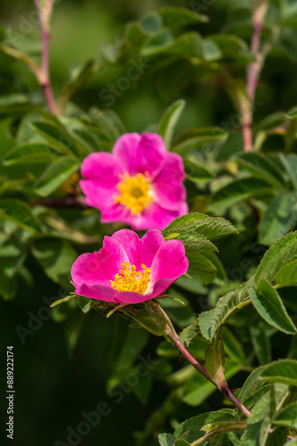 Fototapeta premium Dog rose, Rosa canina, is an important medicinal plant with pink or white flowers and is used in medicine. It is a wild rose and has red rosehip fruits in the fall