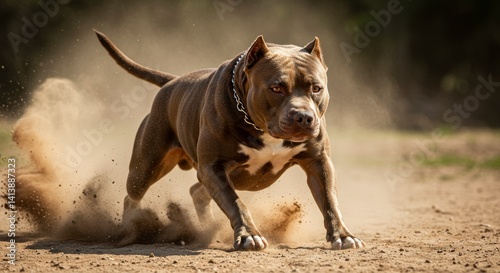 © Manji, Fototapeta premium Dog Running Fast on Dirt Ground with Dust Kicking Up
