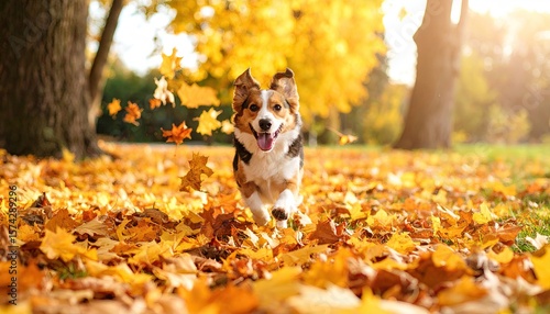 © Gelas, Fototapeta premium Dog running in autumn leaves