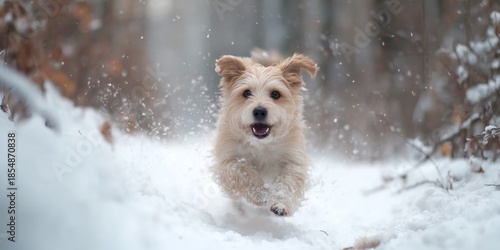 Obraz premium Dog runs joyfully through snow in forest during winter day