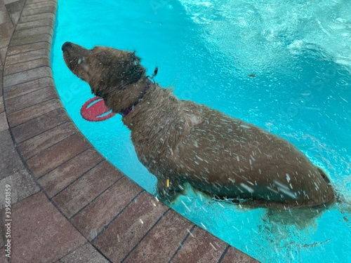 © Garrett Chinn, Obraz premium Dog shaking off water in the pool.