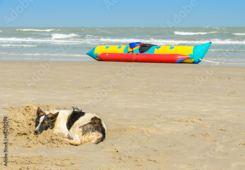 © boonsom, Obraz premium Dog sleeping on beach sand