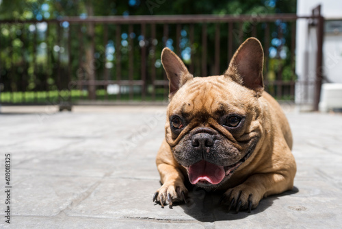 Fototapeta premium Dog sticking tongue out lying in the sun on summer.