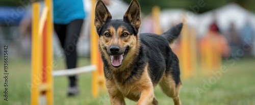 Fototapeta premium dog trainer showcases agility techniques with a lively dog