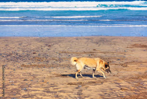 Naklejka premium Dog walks along a sandy beach, evoking a sense of calm solitude. Lonely dog...