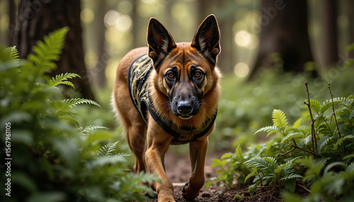 © Vladimir, Naklejka premium Dog wearing rescue vest walking in forest surrounded by ferns