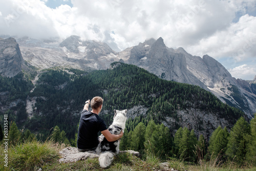 Naklejka premium dog with a man in the mountains at sunrise. travel with a pet.