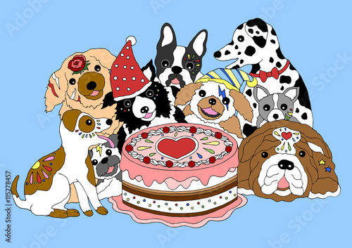 © Benjavisa Ruangvaree, Obraz premium dogs happy birthday party with big cake, hand drawn vector