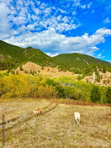 © Mckenzie, Naklejka premium Dogs hiking into the mountains with fall foliage