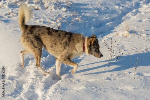 © Mountains Hunter, Naklejka premium Dogs play in the snow in winter, Beautiful portrait of a pet on a sunny winter day