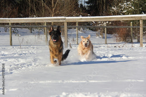 © Anastasia, Naklejka premium Dogs playing in the snow. Golden Retriever and German Shepherd in the snow. Dogs running. Two dogs playing.