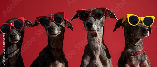 © Funk Design, Obraz premium Dogs with Sunglasses on Red Background, Cool Stylish Pets, Copy Space