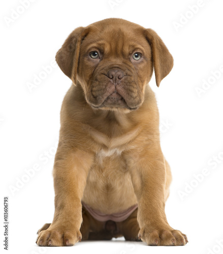 Obraz premium Dogue de Bordeaux puppy sitting in front of a white background