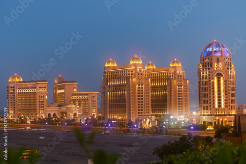 Naklejka premium Doha, Qatar October ‎9, ‎2024: A view of Katara Park and Doha Towers with...