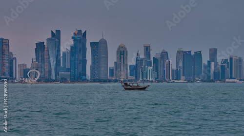 © Mohamed, Fototapeta premium Doha Qatar skyline from corniche promenade sunset shot showing dhows in Arabic gulf with Qatar flag