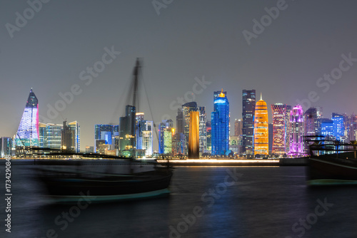 © raul77, Fototapeta premium Doha Skyscrapers and City Center Night Photo, Doha Qatar