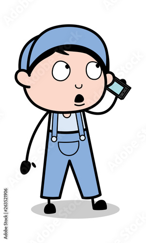 Fototapeta premium Doing Conversation on Call - Retro Repairman Cartoon Worker Vector Illustration