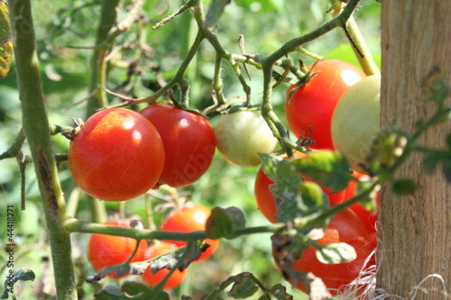 © daily_creativity, Fototapeta premium Dojrzałe małe pomidory koktajlowe wiszące na gałęziach rośliny.