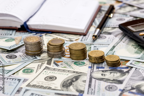 © RomanR, Fototapeta premium dollar bills with coin and calculator. close up.