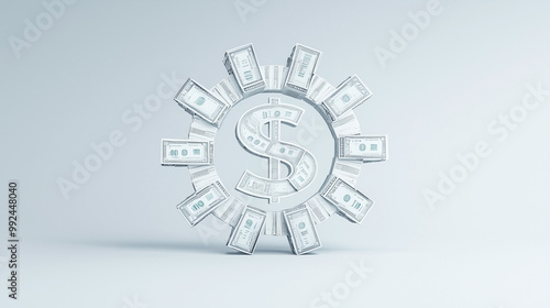 © pattozher, Naklejka premium Dollar Sign Icon Symbol in Circle of Money: A minimalist rendering of a dollar sign icon encased within a ring of stylized dollar bills, symbolizing financial abundance and economic growth.