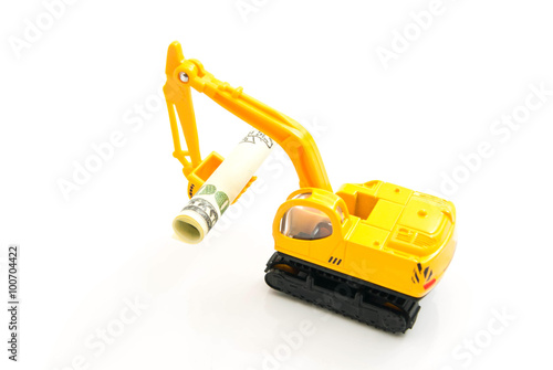 Fototapeta premium dollars banknotes and yellow backhoe