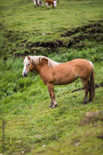 Fototapeta premium Dolomites, Italy - July, 2019: Horses in the farm, Misurina, Cortina...