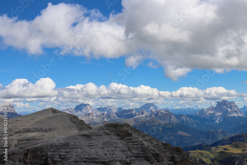 © Catalin, Fototapeta premium Dolomites Italy mountain panorama: aerial cliffs soaring under blue sky and cotton-like cumulus clouds