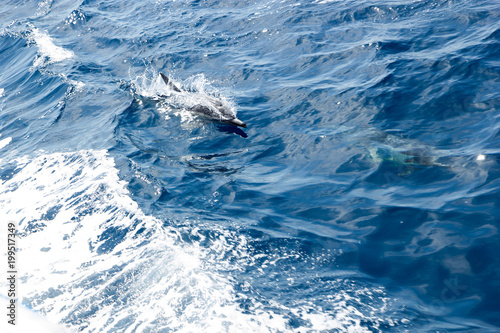 Obraz premium Dolphin accelerating in water getting ready to jump, Southern California