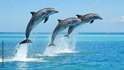 Fototapeta premium Dolphin acrobats: three dolphins leaping from the ocean.