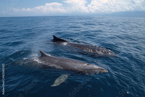 Fototapeta premium Dolphin and whale swimming together in tranquil blue ocean under bright sunny sky with distant mountains in background