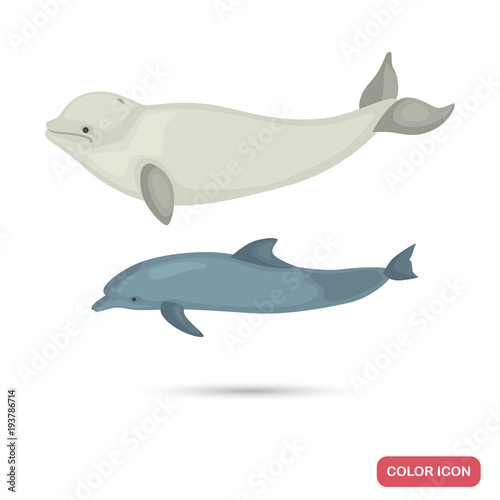 Fototapeta premium Dolphin and white whale color flat icons set