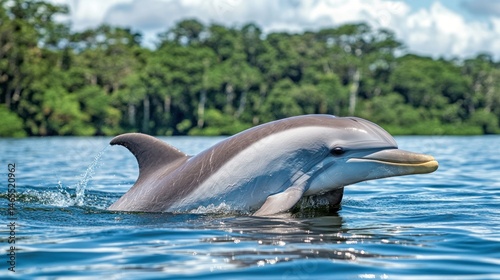 © SUTRININGSIH, Naklejka premium Dolphin emerging from water, lush forest backdrop