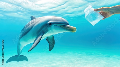 © ADD PHOTO, Naklejka premium Dolphin Interacting with Human Underwater Scene