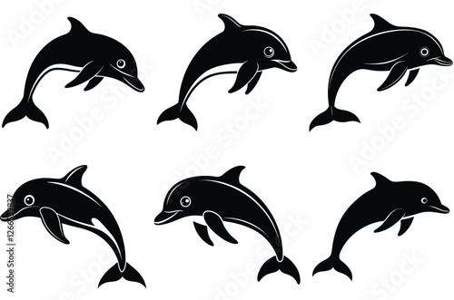 Fototapeta premium Dolphin jump silhouettes, playful dolphins silhouette vector set