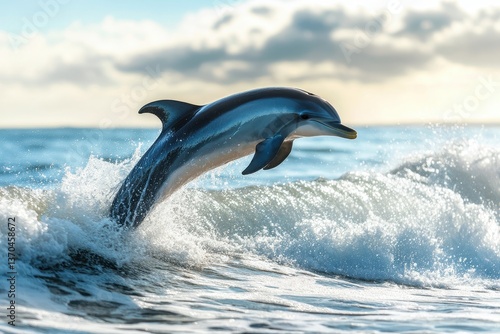 Fototapeta premium Dolphin jumping above ocean waves during sunset in a serene coastal environment