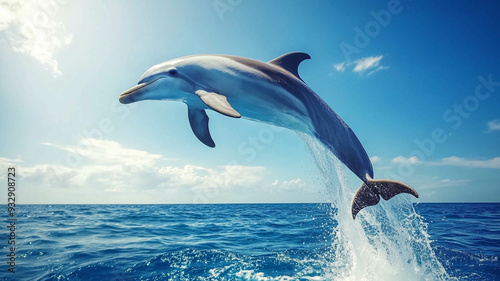 Fototapeta premium dolphin jumping out of the water against a bright blue sky,