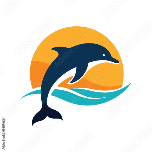 Fototapeta premium Dolphin jumping with ocean wave and sunset sky in tropical evening light