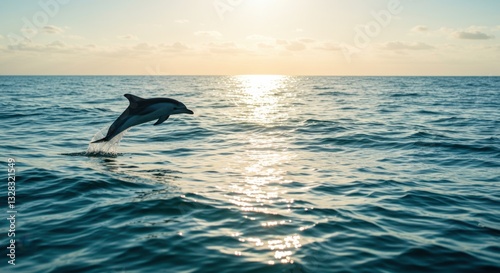 Fototapeta premium Dolphin Leaping at Sunset: A Majestic Ocean Moment Captured in Golden Light
